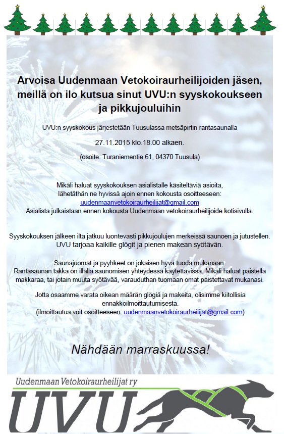 Uudenmaan Vetokoiraurheilijoiden syyskokous ja pikkujoulut järjestetään 27.11.2015 Tuusulan metsäpirtinn rantasaunalla, lue kokouskutsu tästä: UVUn pikkujoulut